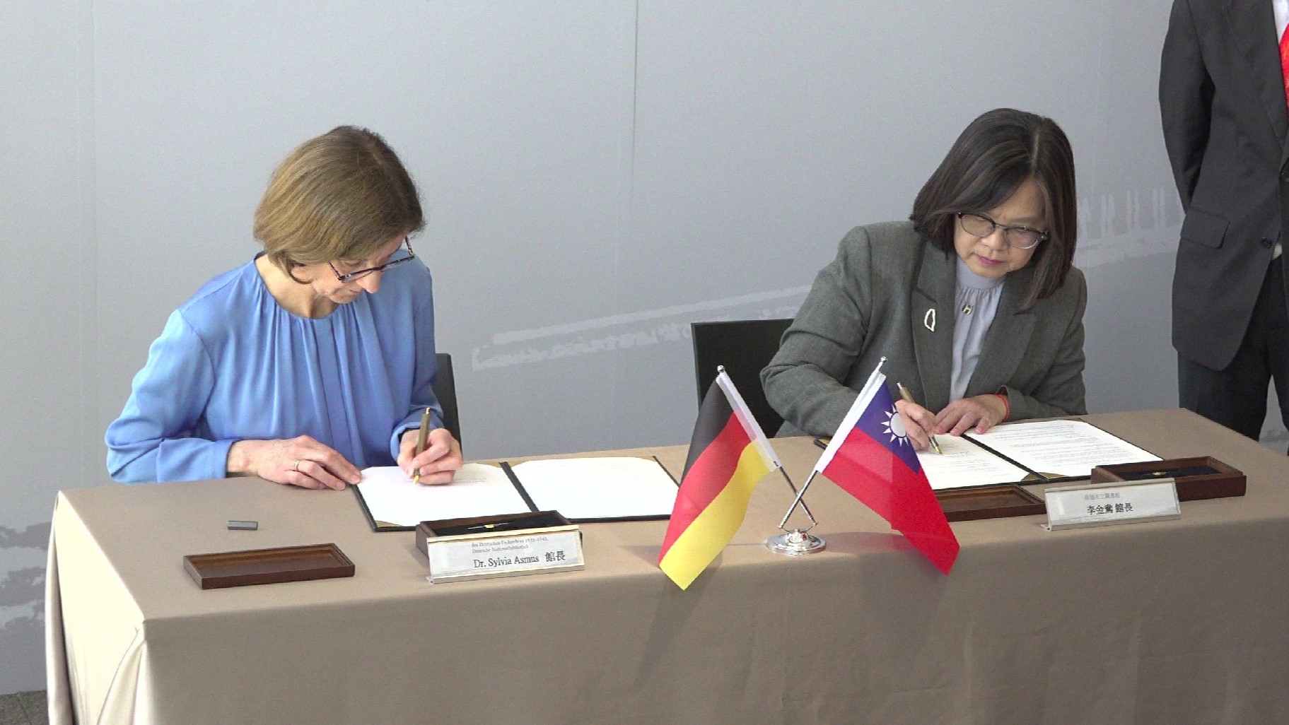 ↑圖說:高雄市立圖書館館長李金鴦(右)與德國國家圖書館流亡檔案館館長Dr. Sylvia Asmus(左)正式簽署合作協議。(圖片來源:記者 賴君欣 拍攝)