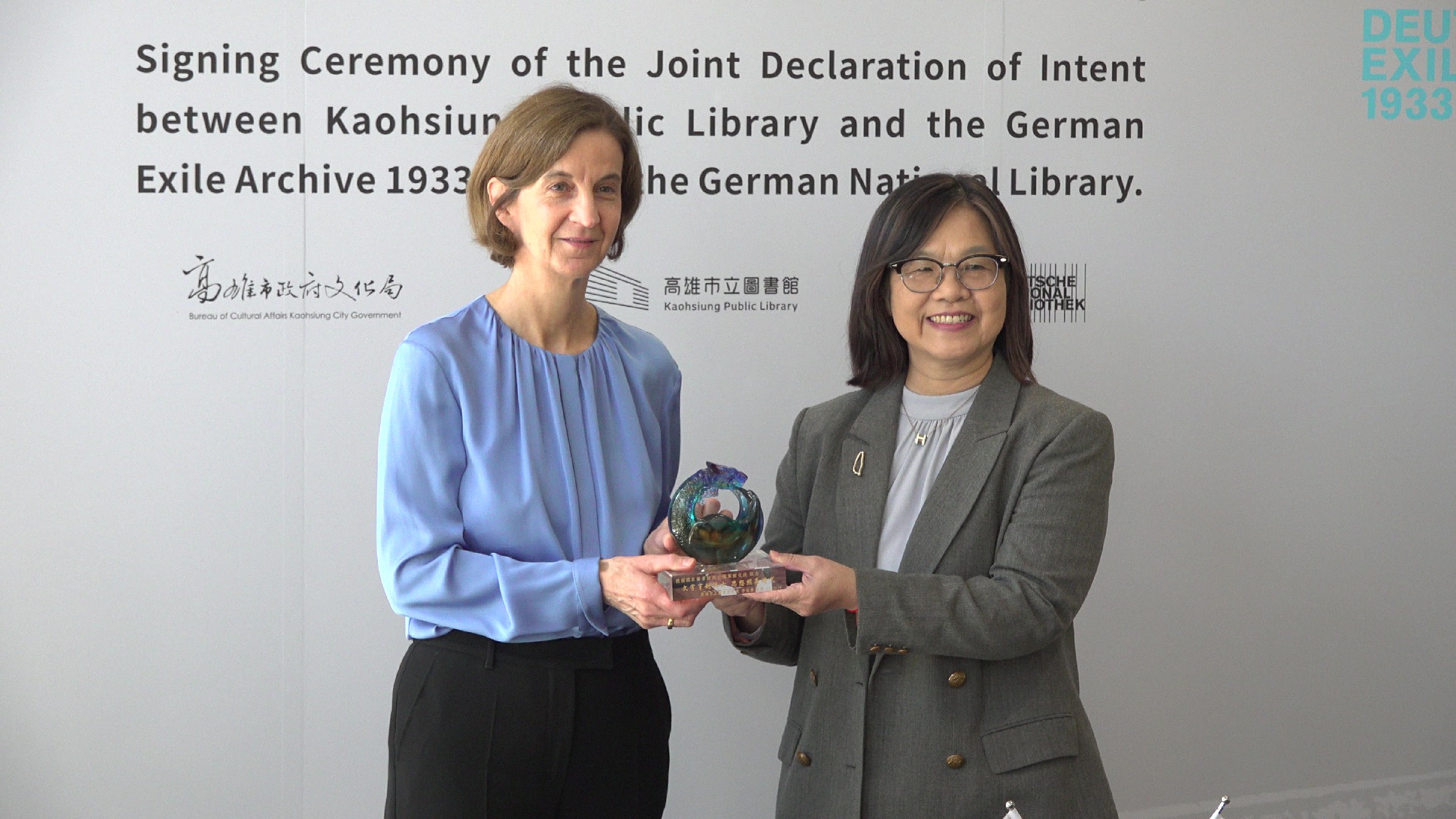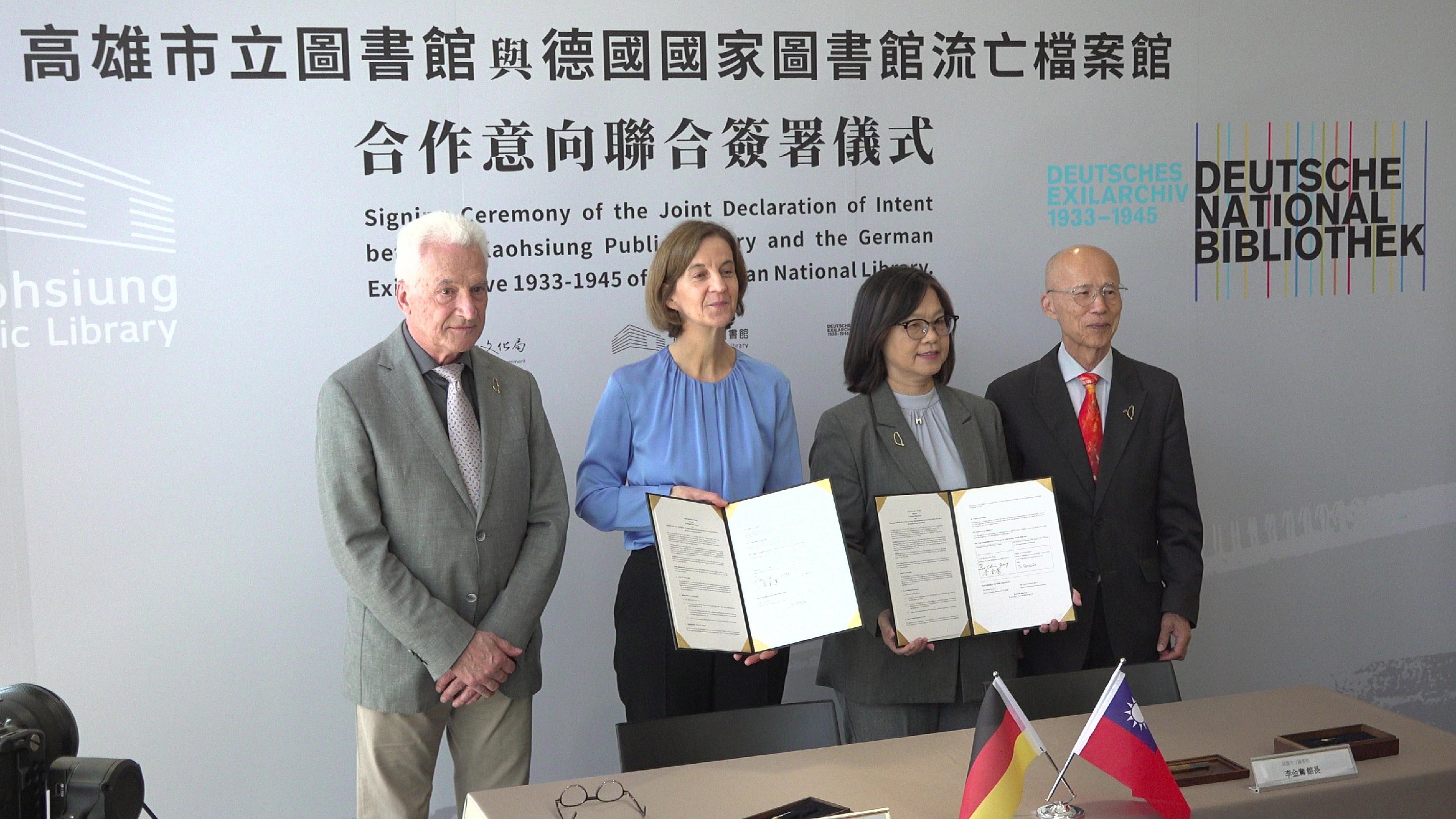 高雄市立圖書館16日正式與德國國家圖書館流亡檔案館(Deutsches Exilarchiv 1933–1945)簽署合作備忘錄,為臺德文化交流再添里程碑。簽署儀式以德國書業和平獎得主、流亡作家廖亦武的演出揭開序幕,由高市圖館長李金鴦與德國流亡檔案館館長 Sylvia Asmus 博士代表簽署,並由前德國駐日大使 Volker Stanzel 與前臺灣駐法大使呂慶龍共同見證,象徵兩地在文化及價值理念上的深度連結。