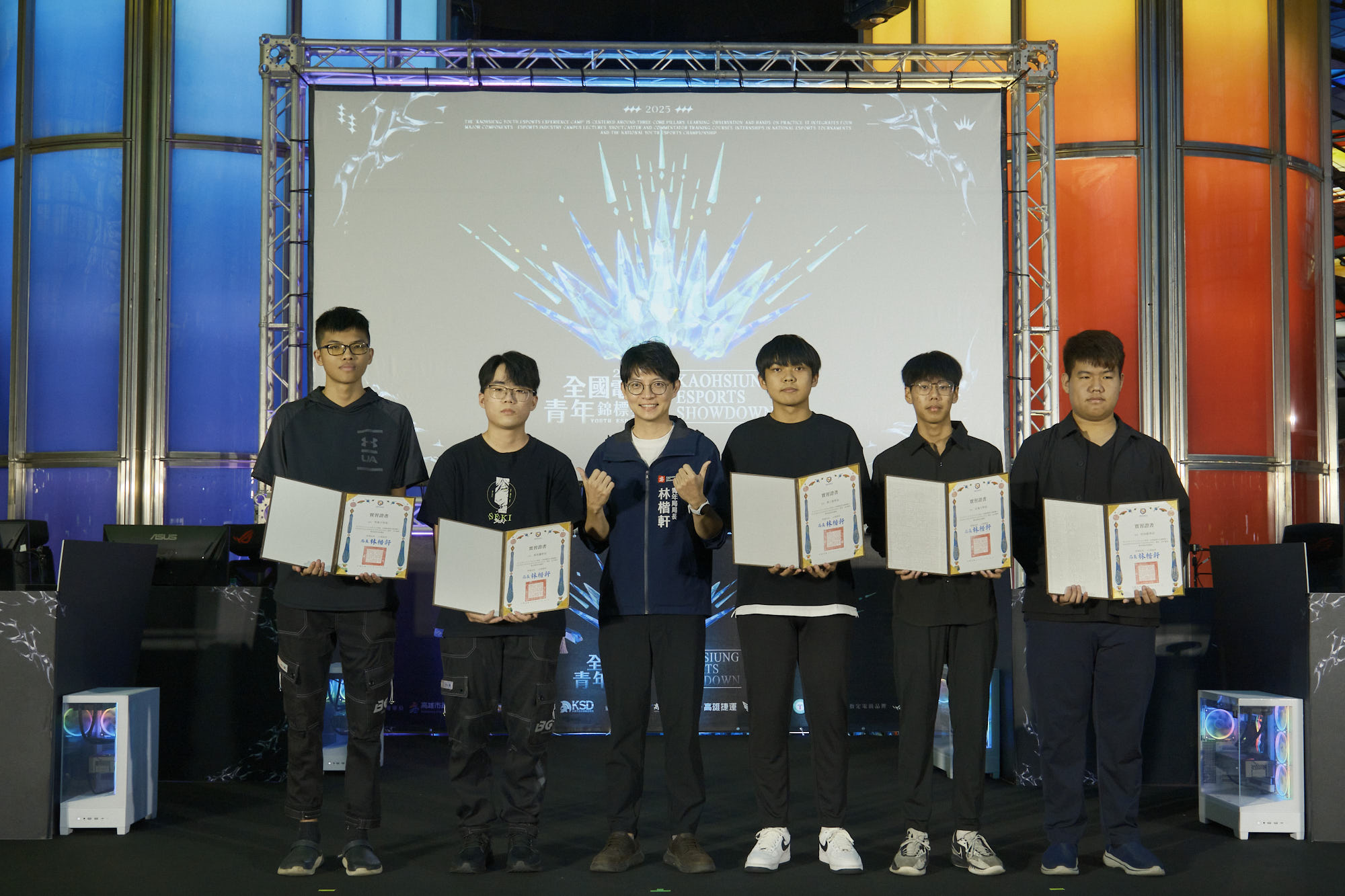 ↑圖說:青年局長林楷軒(左三)於活動現場頒發實習證書,肯定參與賽事協助的實習生,鼓勵持續投入電競產業發展。(圖片來源:高雄市青年局提供)