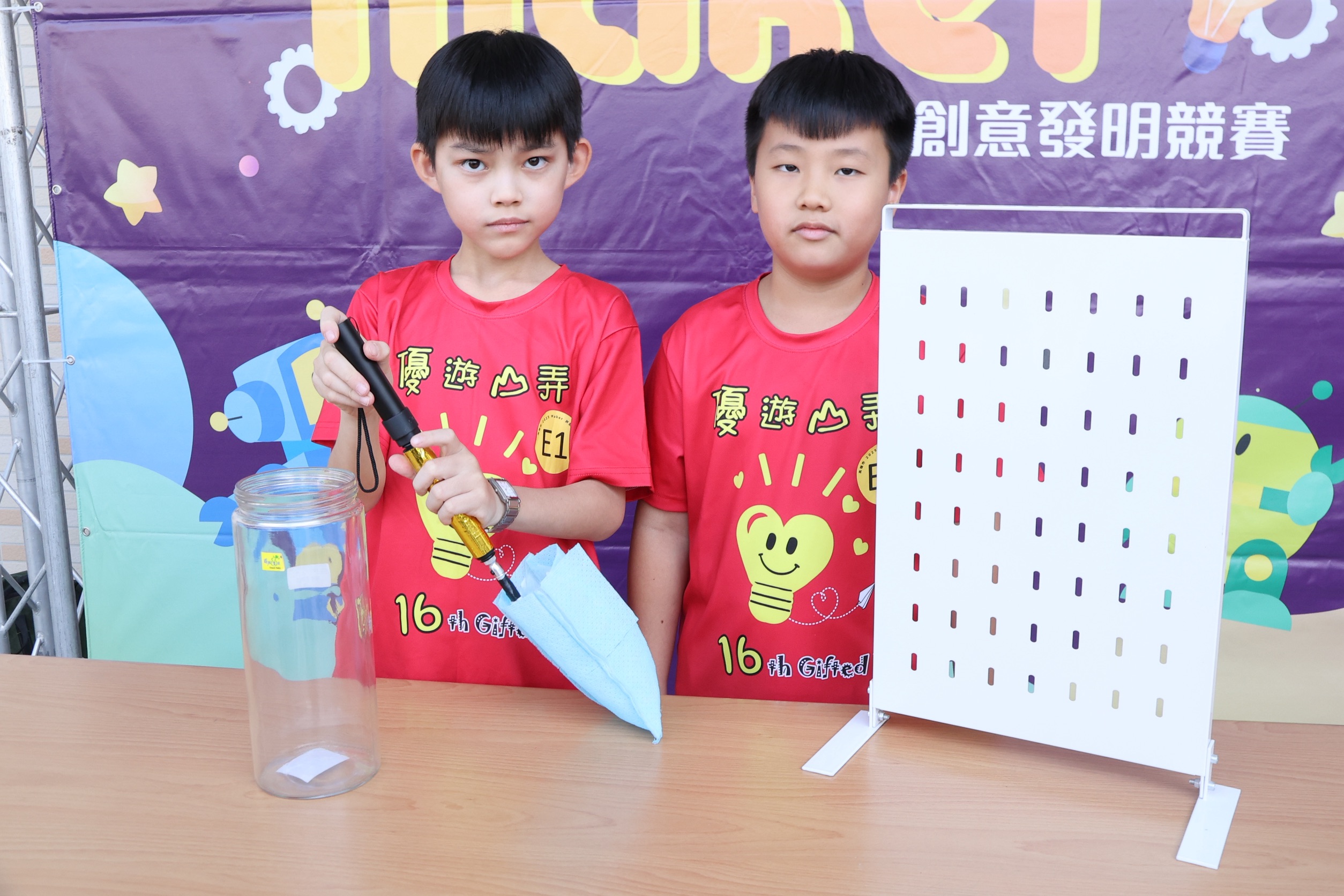 此外,福山國小王亮鈞、曾宥竣同學發明「全方位氣控調節刷」,可以調整大小,遇到比較高或比較深的罐子時,也不怕刷不到底部。東光國小王鈺淇同學拿下國小高年級組第一名的作品「書櫃遮擋裝置」,設計原理為利用電磁鐵吸力,常態磁吸固定該遮擋板,地震發生時,動態感應單元控制電磁鐵斷電,可快速放下該遮擋板,以防書本掉落。