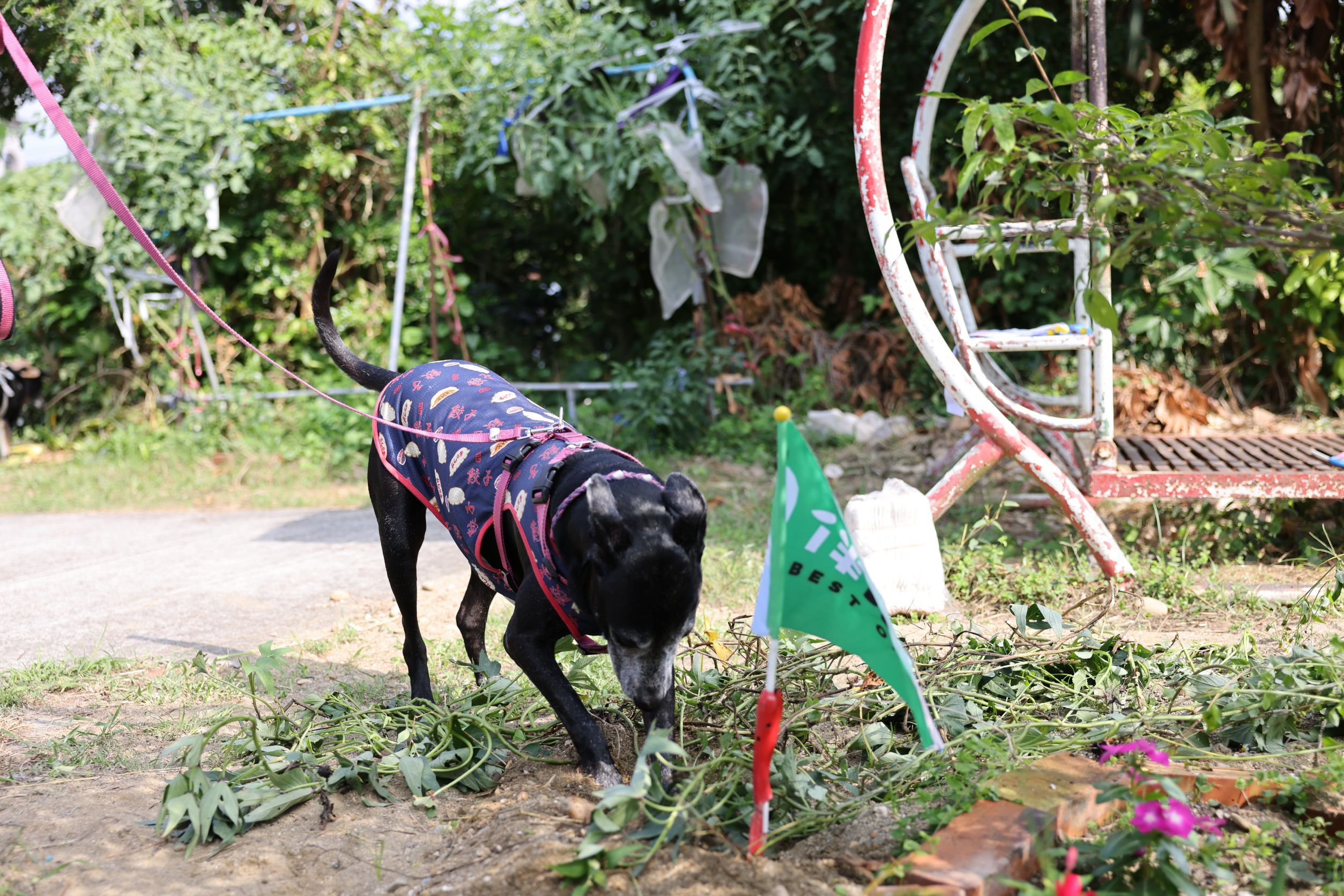 農田裡最受矚目的,是被封為「地瓜獵人王」的米克斯「噠噠」。牠一踏進泥地便興奮得難以自制,鼻子嗅得準、爪子挖得快,速度之快讓飼主直呼驚訝,還笑說:「牠太愛烤地瓜了,今天肯定是聞到香味整個停不下來!」另一邊,來自燕巢收容所、如今被領養回家的「花生」和「卡布」則以圓滾滾的身影、戴著小草帽在田裡打滾,逗得眾人捧腹。活動現場還為每隻狗準備寵物草帽,讓毛孩們化身超萌小農夫,萌度爆表。