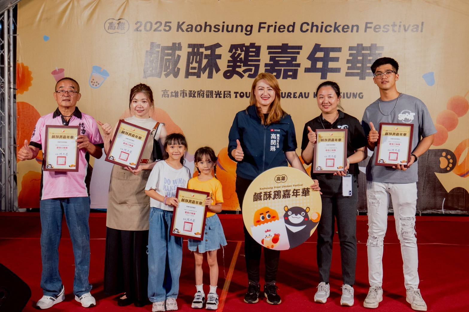 ↑圖說:觀光局長高閔琳頒發本年度「最佳人氣獎-統香鹹酥雞嘉義總店」及「最佳口味獎」、「炸工超群獎」、「特色風味獎」、「獨特創新獎」等獎項。(圖片來源:高雄市觀光局提供)