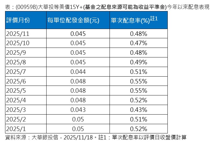 每月配息的(00959B)大華投等美債15Y+,年終配息初估出爐,每單位預計配發0.045元,連4個月不變,本次除息交易日為12月4日,收益發放日為12月26日。若想參與此次配息發放,最後買進日為12月3日。