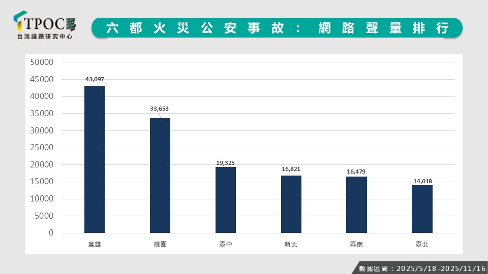 六都近半年在火災與公安議題中,高雄市以43,097則成為聲量最高的城市,較第二名的桃園高出近1萬則聲量,其討論主要集中在兩起重大事故。除了7月鋰電池廠爆炸引發大量關注外,9月興達電廠事故更將討論推向高點。市長陳其邁以「發電風險不能全推給高雄」回應外界疑慮後,引起強烈反應,不少網友質疑此說法欠缺負責態度,也有人延伸討論高雄長期的安全管理問題,甚至嘲諷「預算拿最多、出事也最多」,使討論持續發酵,成為高雄在此期間的主要聲量來源。