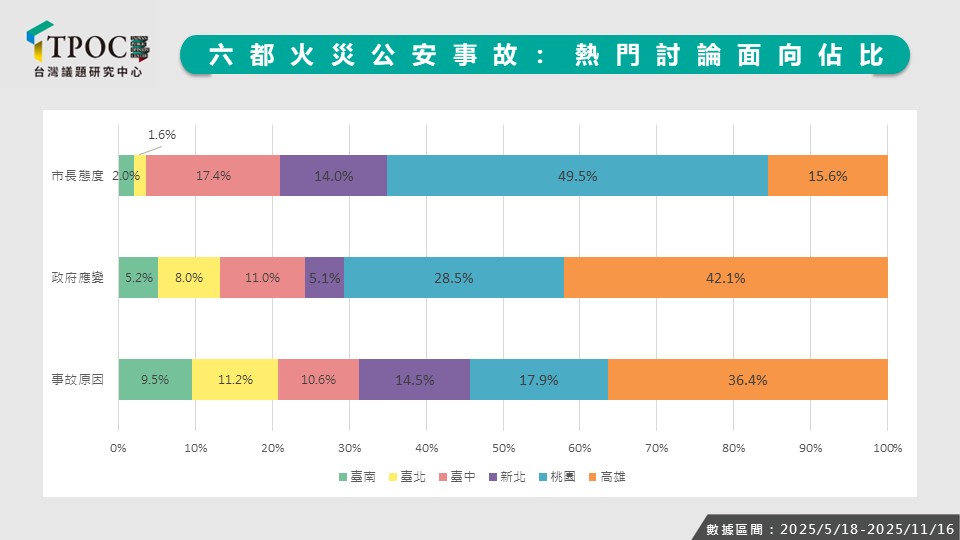 今年多起火災事故引發全台關注,從高雄興達電廠天然氣爆炸,到桃園南門市場大火燒毀上百攤位,火災與公安議題再次成為輿論焦點。這類事件不僅檢驗地方政府的危機應變與善後能力,也牽動政治人物在突發狀況下的溝通策略與形象管理。TPOC台灣議題研究中心透過QuickseeK快析輿情資料庫觀察六都火警事故的討論,發現高雄市討論度最高,其中市長陳其邁在興達事故後的回應引發爭議;桃園市聲量位居第二,但在「市長態度」的討論中佔比最高,張善政未在南門市場大火發生後第一時間現身,引發正反兩派討論。