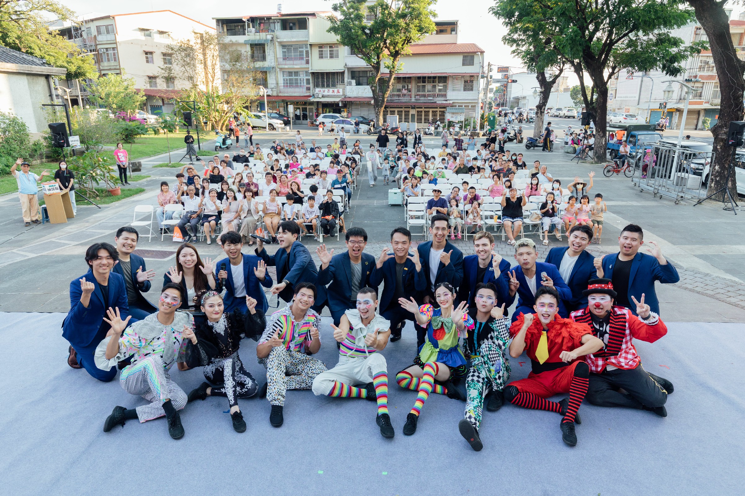 ↑圖說:FOCASA馬戲團與拉縴人歌手和美濃鄉親大合照,歡慶美濃分館開館十週年。(圖片來源:高雄市立圖書館提供)