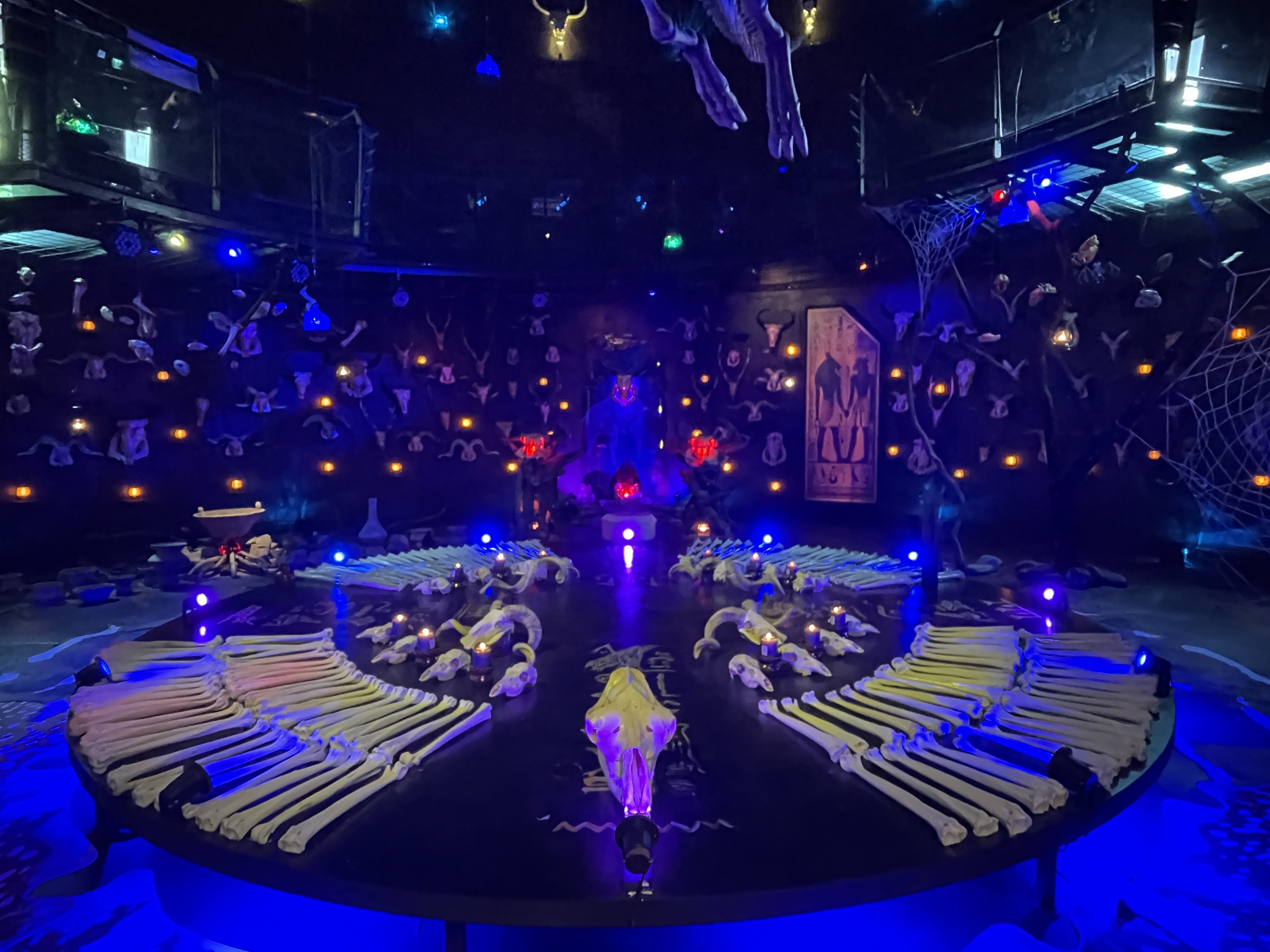 「獸骨祭壇」由十鼓藝術與美術團隊歷時近一年打造,運用共405件仿真獸骨,包括豺狼、牛、羊、駱駝、鱷魚與狐狸等元素重組,營造介於神祕與莊嚴之間的儀式空間。祭壇中央以鴕鳥腿骨、山羊與犀牛等巨骨環繞,象徵靈魂在輪迴中再生;四周佈滿駱駝頭骨、鬼火燭光與大型蜘蛛網結界,上方懸掛「天空之主」翼龍骨架,牆面則結合公牛神、羊神意象與象形文字圖騰,將古文明意象轉化為可親近的劇場體驗。