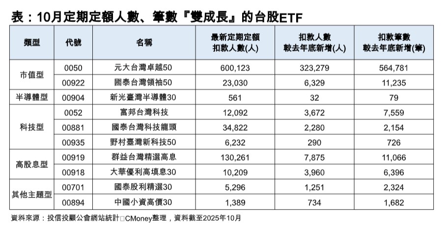 根據投信投顧公會網站ETF專區資料顯示,今年以來截至10月止,每月扣款戶數增加21萬6763人,成長12.94%;扣款筆數方面,整體國內股票ETF新增18萬752人,增幅6.2%;金額方面,全體國內股票型ETF從今年以來到10月止,每月扣款金額拉高至17.1億元,金額成長14.36%,顯示台股ETF定期定額三數(戶數、人數、金額數)三升。