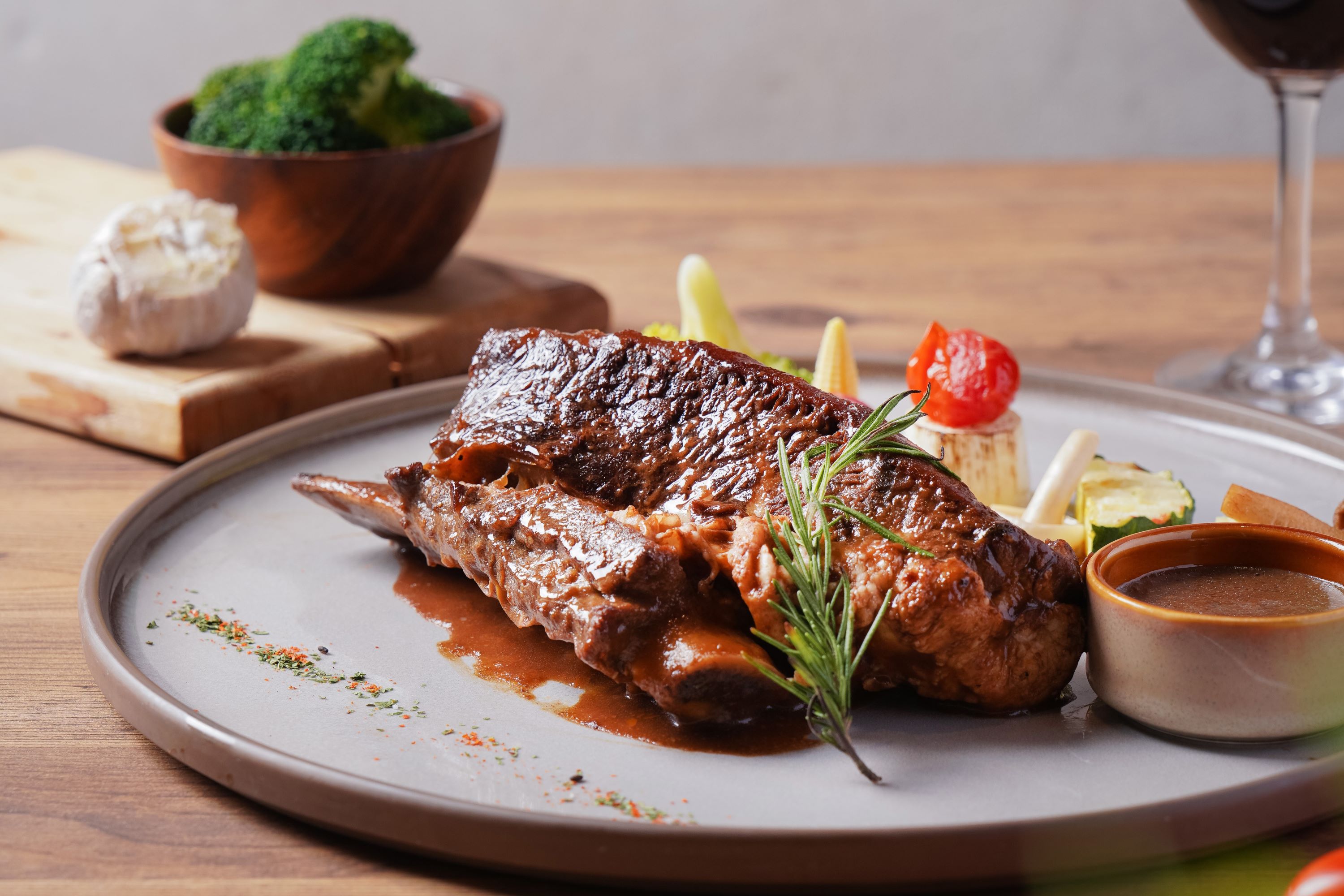 ↑圖說:Cozzi THE Roof餐廳即日起至2026年1月11日推出獎勵兌換優惠,會員可扣抵10,000點享兩客「紅酒燉台塑牛小排」主餐附自助吧,兌換價值超過2,400元。(圖片來源:和逸飯店‧高雄中山館提供)