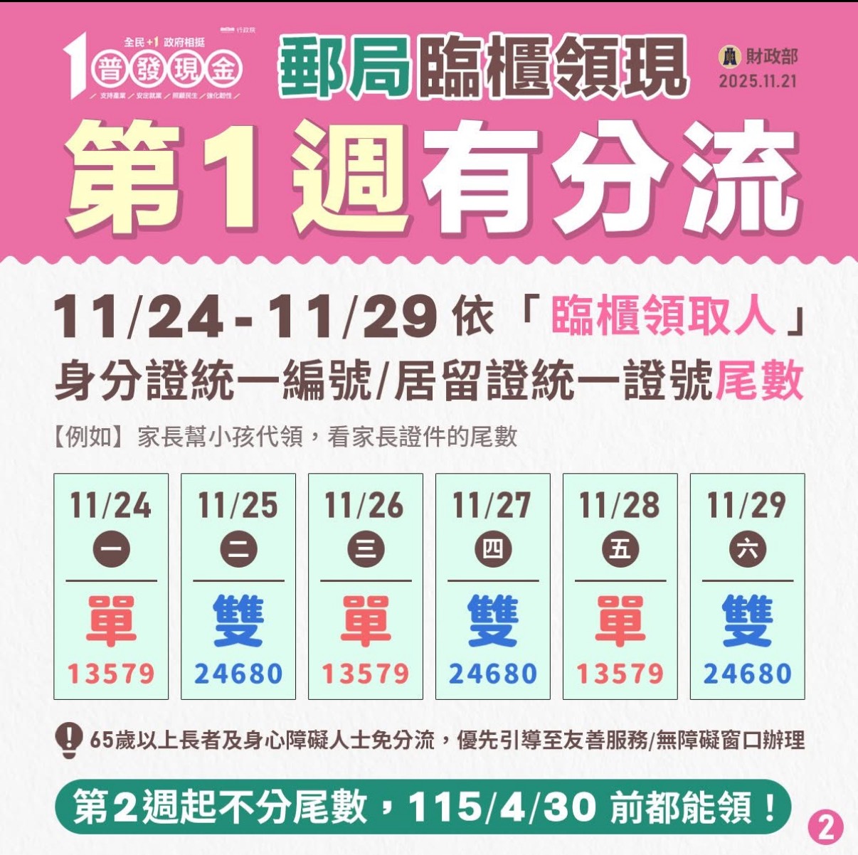 等到第2週開始,就不再分尾數,在明(115)年4月30日前都能領。