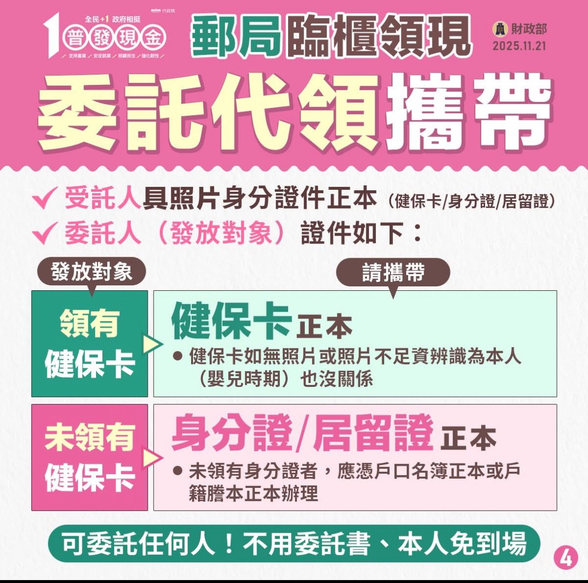 財政部說,民眾可委託任何親朋好友幫忙到郵局代領,免委託書、本人免到場!