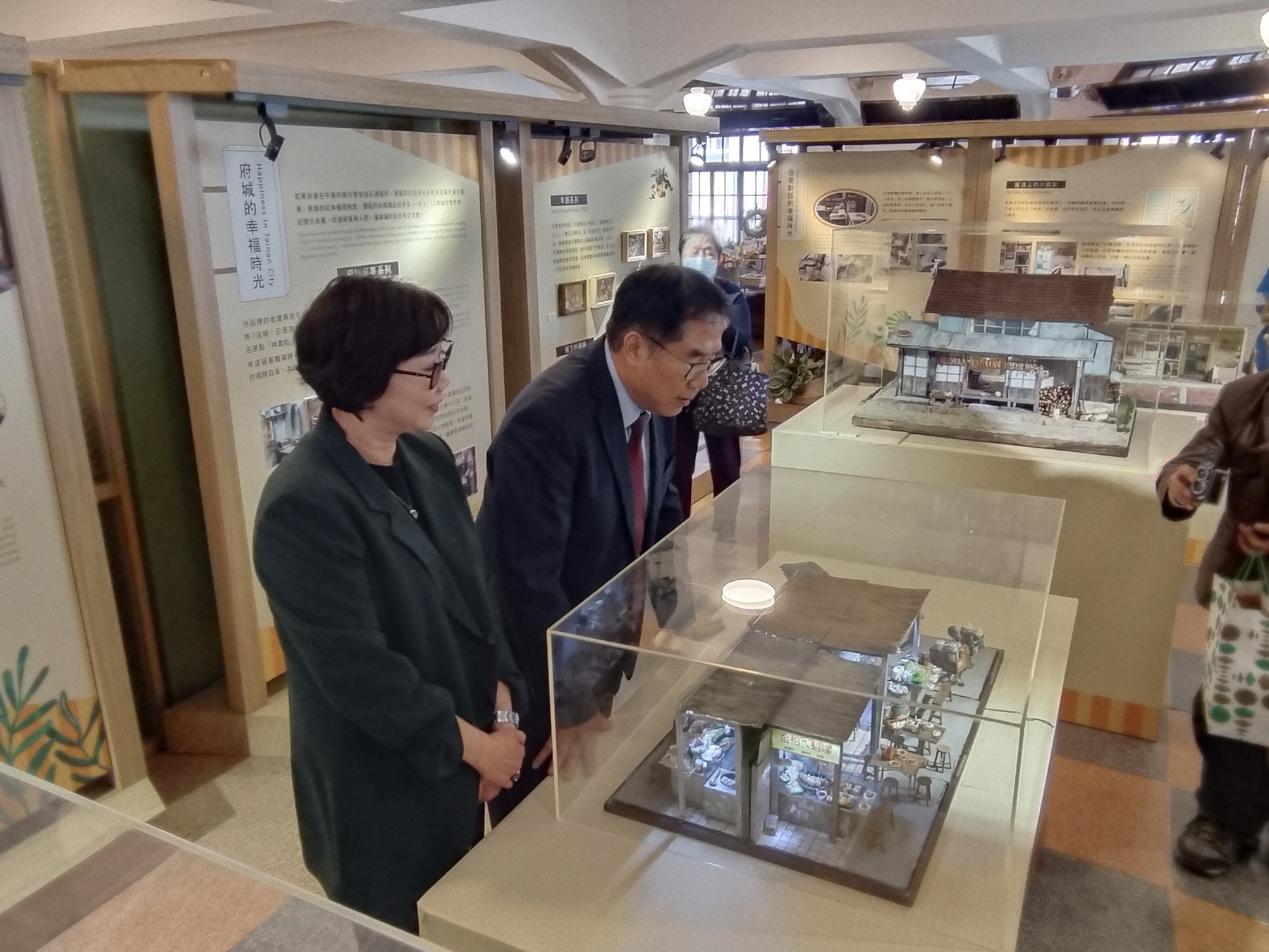 圖說:市長黃偉哲與林百貨董事長陳慧姝駐足欣賞「小世界大熱鬧」(圖片來源/文化局提供)