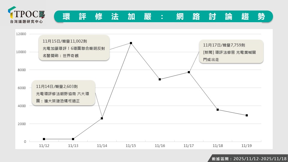 網路討論顯示,光電環評修法議題自11月14日起迅速升溫。當天立法院進行朝野協商,六大環團隨即發出緊急聲明,警告禁建與加嚴可能「矯枉過正」,帶動聲量達2,603則。隔日(11月15日),討論熱度持續攀升,環團反對立場引發部分網友質疑其動機,認為可能涉及利益考量。名醫蘇一峰更批評環團護航光電業者,直呼「世界奇觀」,當日聲量飆升至10,769則。11月17日,有媒體報導光電業者「喊關門或出走」,強調不願成為政治鬥爭的犧牲品,消息再度引發討論,網友多以嘲諷語氣回應「慢走不送」,再使當日討論聲量升至7,759則。