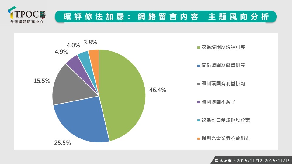 此外,4.9%留言「諷刺環團不演了」,以揶揄語氣指稱環團過去以捍衛環境為名,如今因利益考量露出真實立場。另有3.8%「諷刺光電業者不敢出走」,多以反諷方式嘲笑光電業者的出走言論。然而,也有4%聲量抱持不同看法,「認為藍白修法拖垮產業」,主張反對聲浪與政策加嚴背後另有政治意圖,認為修法可能被當作攻擊執政黨的手段。