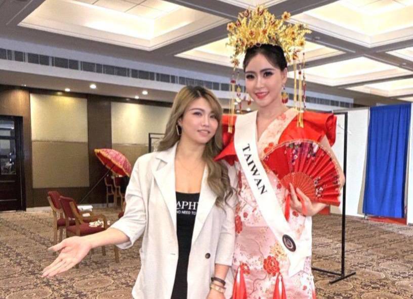 圖說:鄭珊汶(右)穿著改良式旗袍結合鳳冠打造的國服,與業界譽為「冠軍製造機」的許米蓁合影。(圖片來源:鄭珊汶提供)