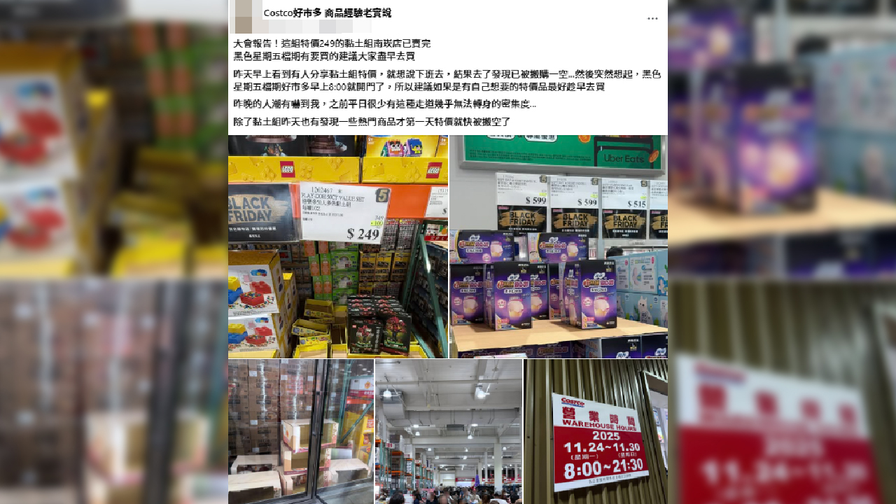 黑色星期五檔期開跑,Costco全台多家門市已出現罕見的人潮潮湧。根據《Costco好市多 商品經驗老實說》社團大量網友分享,南崁店特價 249 元的黏土組在活動第一天即被掃購一空,引發不少父母哀嘆「下班去就沒了」。也因為熱賣速度太快,不少網友才發現本週 Costco 全台門市都提前於早上 8 點開門,導致排隊潮一早從停車場就開始累積。