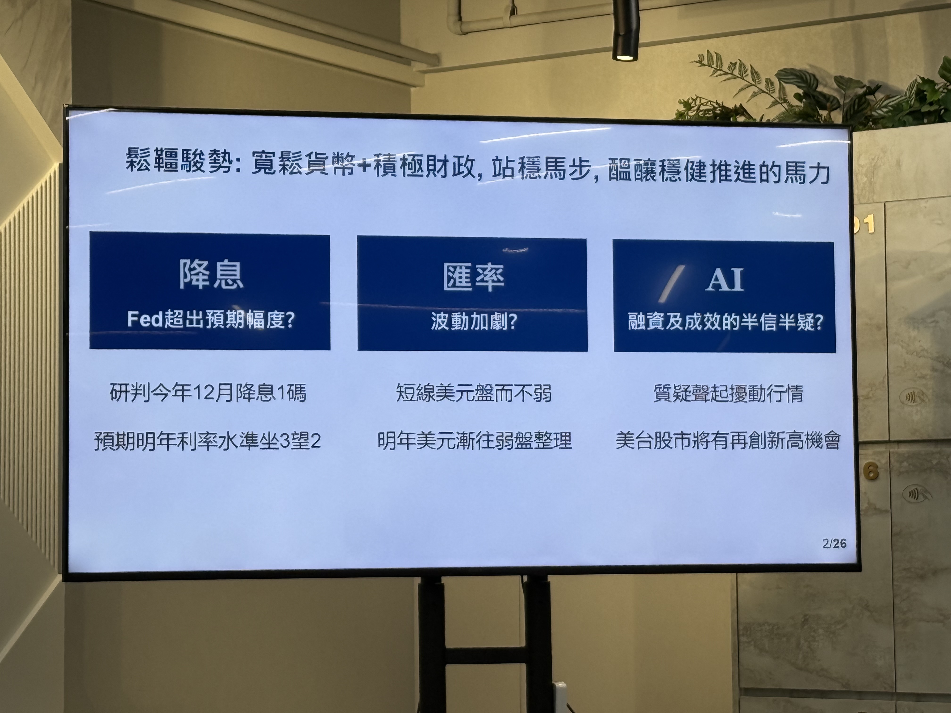 回顧2025年,儘管全球面臨「對等關稅」衝擊,各國依然展現出比預期更強的韌性。美國方面,就業市場較為疲弱,通膨率維持在3%左右,全年經濟仍有近2%的成長;台灣則受惠於AI伺服器與半導體強勁需求推動,全年出口金額上看6200億美元,寫下歷史新高,年增率超過30%。