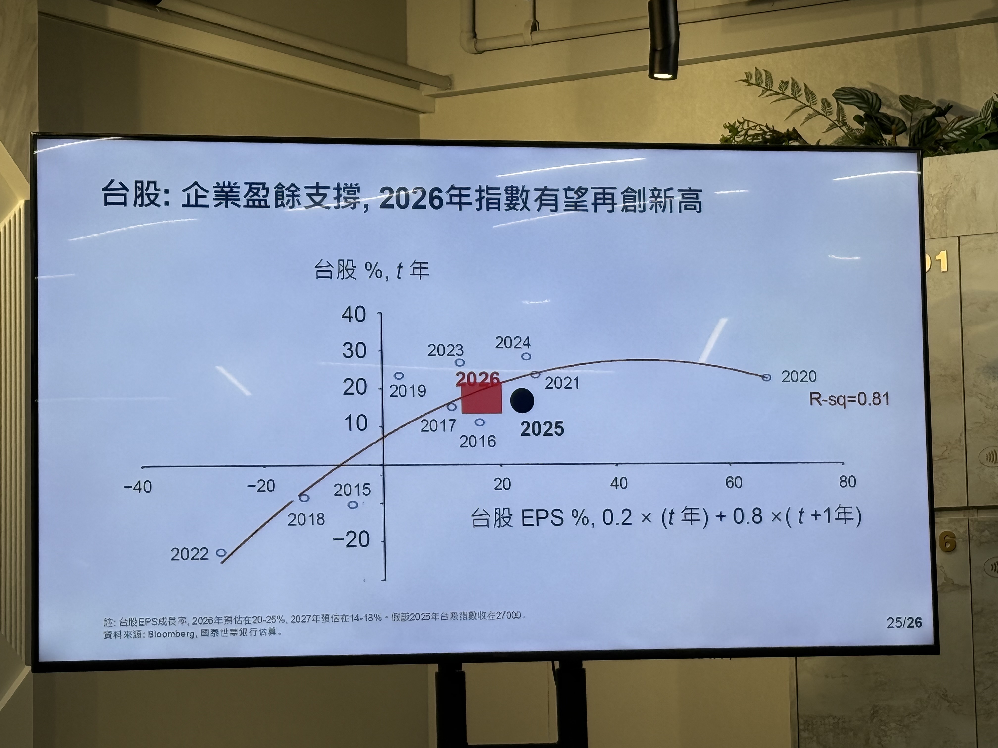 國泰世華銀行今天舉辦「2026全球經濟及市場展望發表會」,研判明後年的企業盈餘仍有雙位數成長,預期美、台股市將有再創新高的機會,其中,台股有機會突破3萬點。