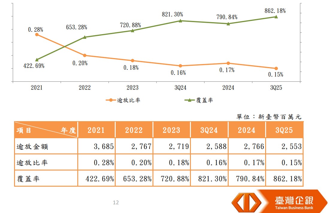 臺企銀前3季累計合併稅後淨利97.86億元,年成長10.36%,獲利續創新高;逾放比率降至0.15%,年減0.01%,備抵呆帳覆蓋率提升至862.18%,年增40.88%。