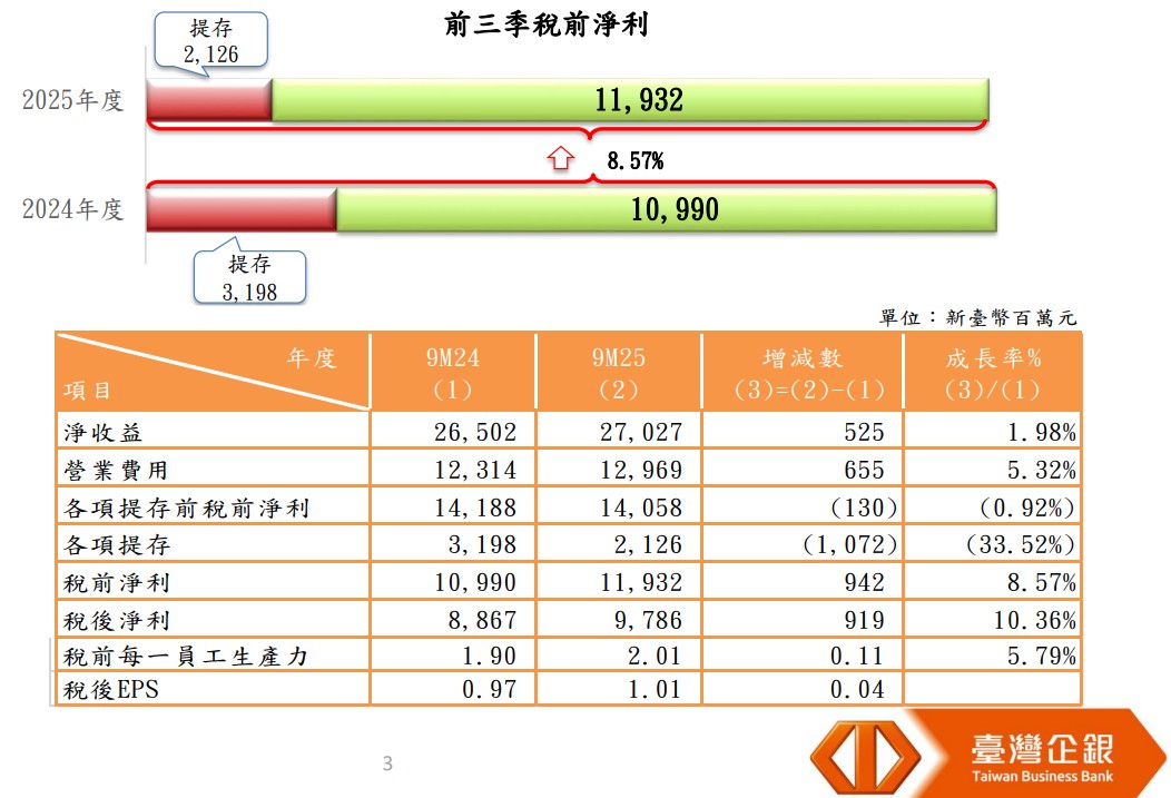今年前3季獲利成長動能主要來自利息淨收益,受惠存、放款營運量成長,平均餘額較去年同期分別增加6.41%及8.15%,同時積極優化存、放款結構,提升收益性較佳之放款業務比重,並強化存款資金成本控管,使存放利差自今年以來逐季提升,在量能擴張與利差提升雙重挹注下,帶動整體利息淨收益成長。