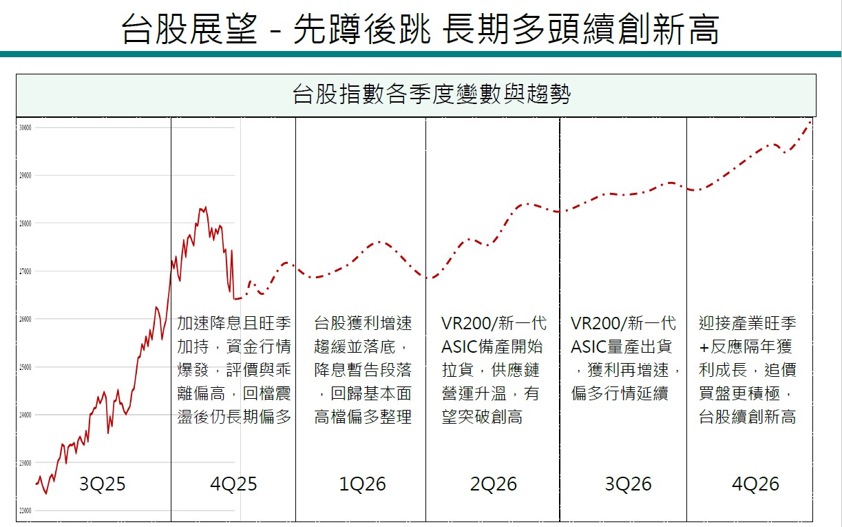 中信投顧預估2026首季,台股獲利增速趨緩並落底,降息暫告段落,回歸基本面高檔偏多整理;第二季VR200/新一代ASIC備產開始拉貨,供應鏈營運升溫,有望突破創高;第三季VR200/新一代ASIC量產出貨,獲利再增速,偏多行情延續;第四季迎接產業旺季+反應隔年獲利成長,追價買盤更積極,台股續創新高。