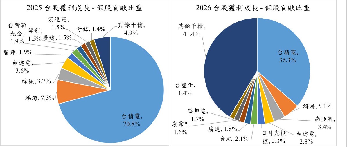 中信投顧預期,2025年台股獲利年增僅約7%,主因逾6成公司呈現衰退(台股創新高,但逾6成個股跌破年線);預期2026年台股獲利年增約20%,仍由電子權值撐腰,但貢獻比重有所降低,結構分化改善;非電與中小型,銜接低基期+關稅鈍化+降息,營運展望復甦轉佳,盤面有望轉趨欣欣向榮。