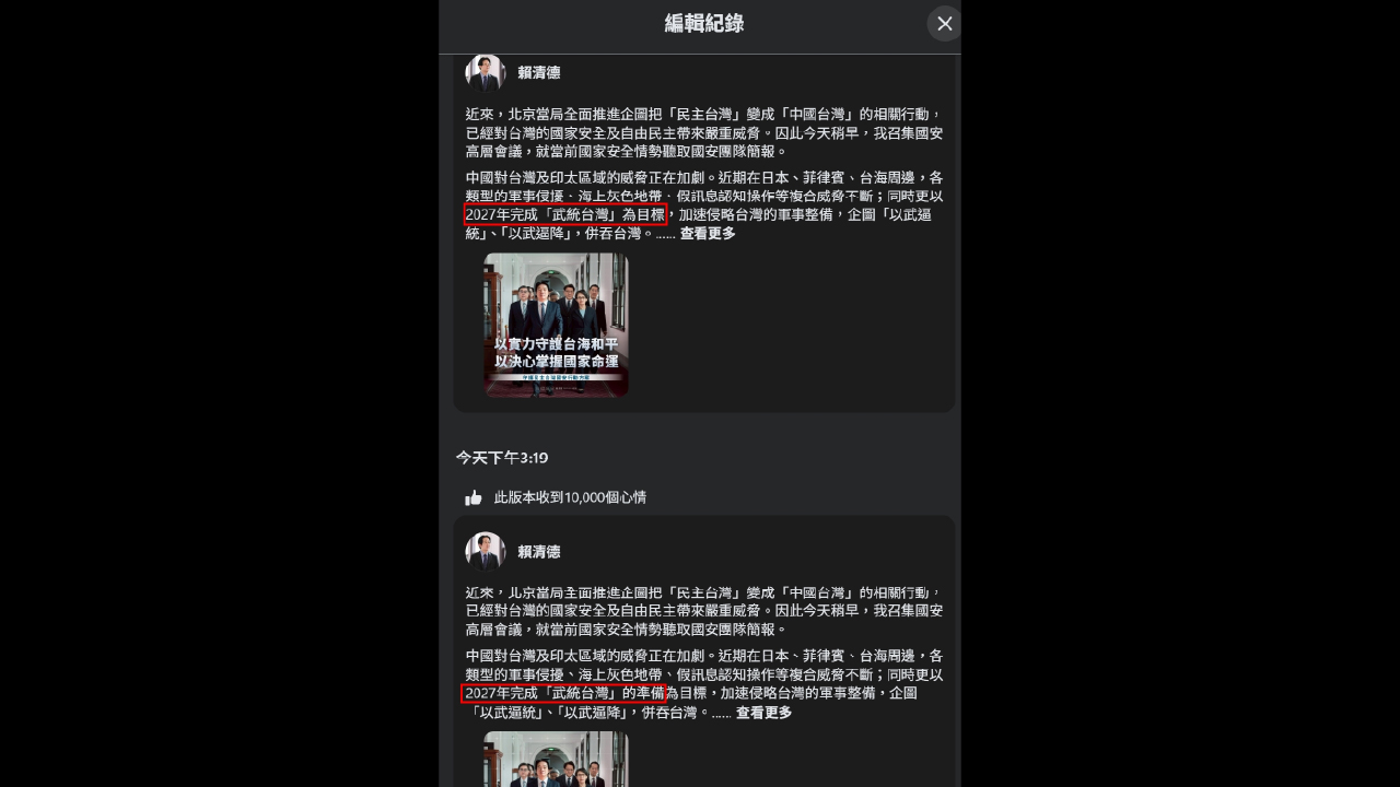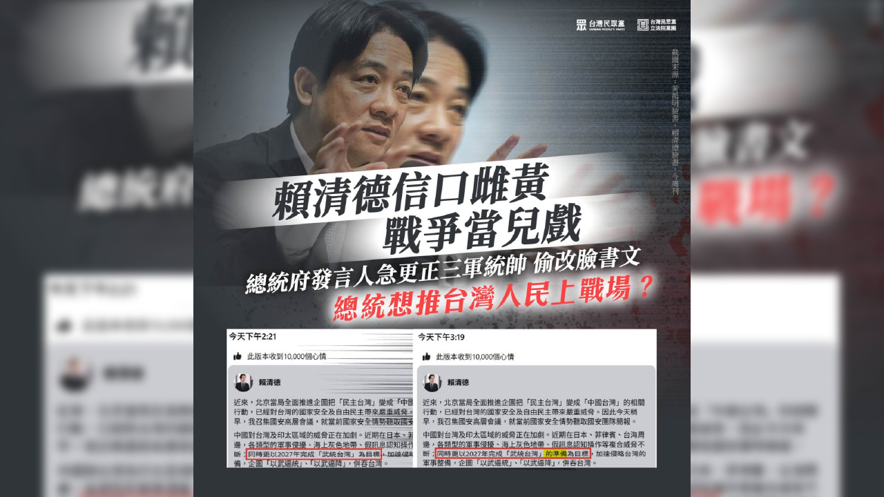 民眾黨轟賴清德「2027武統說」製造恐慌 總統府急改臉書遭抓包