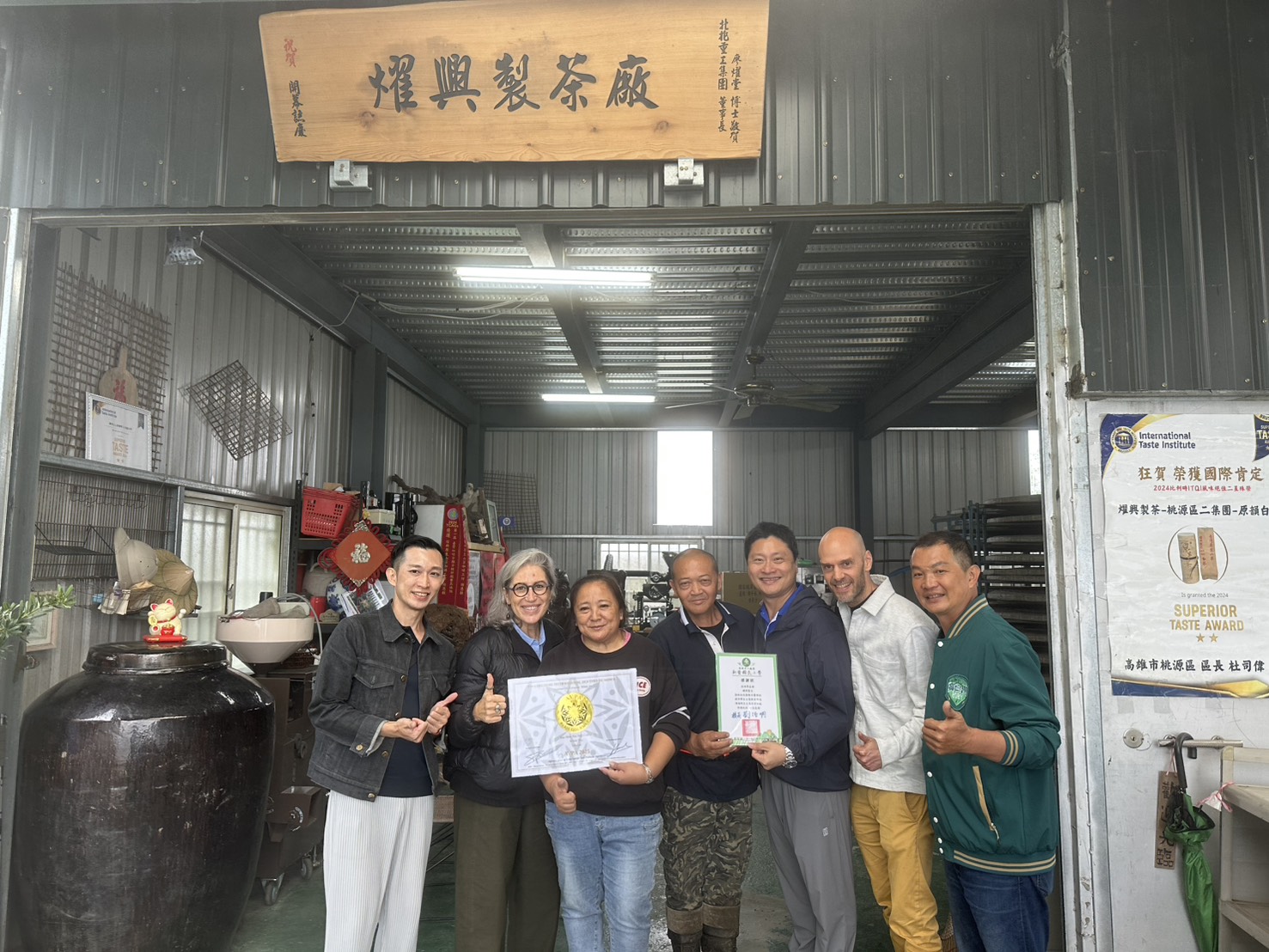 ↑圖說: 苗栗雪見高山茶製茶師張立欣(左1)帶領AVPA評審主席Carine Baudry(左2)與技術評審Florian Aumaire(右2)南下六龜實地訪查,於「燿興原生山茶咖啡工坊」合影。(圖片來源:高雄市農業局提供)