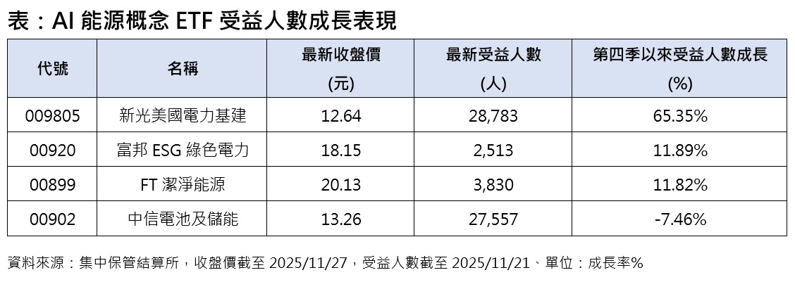 海外電力能源相關ETF近期買氣大增,包括新光美國電力基建(009805)、富邦ESG綠色電力(00920)、FT潔淨能源(00899),第四季以來受益人數成長逾雙位數表現。