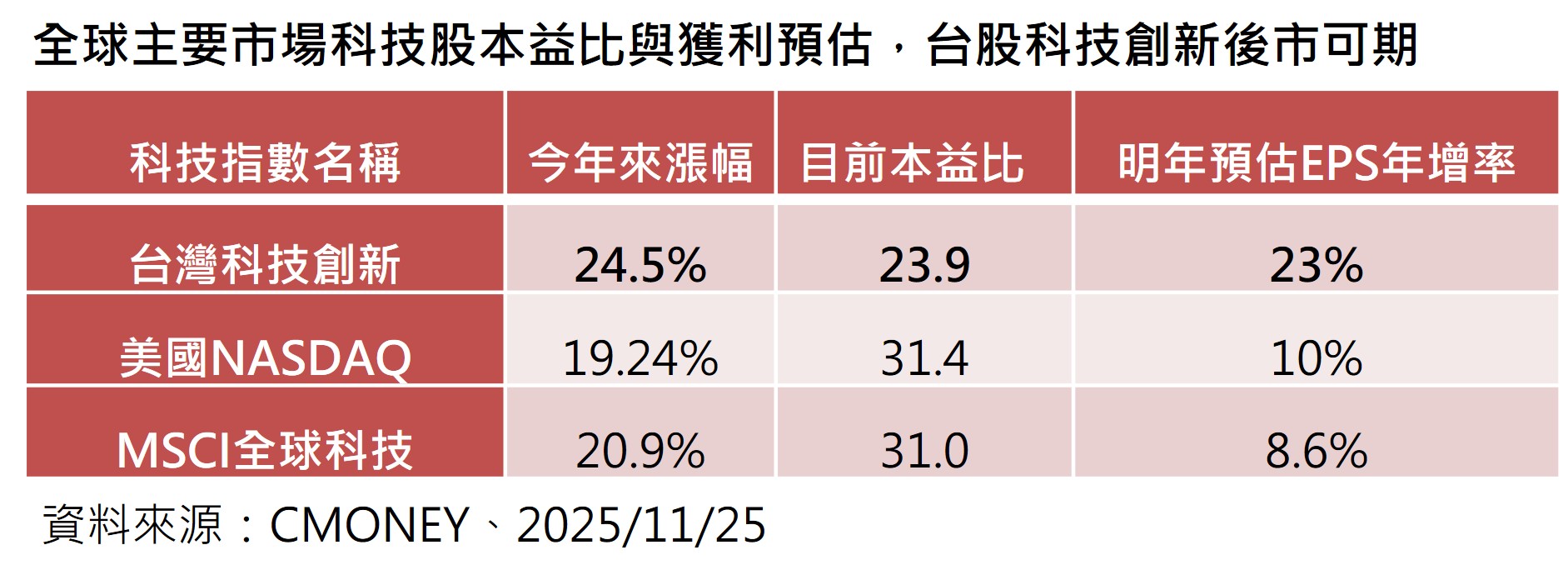 再以明年獲利預估來看,台灣科技股仍有逾二成的成長空間,獲利成長態勢強勁,更彰顯台灣科技的投資價值,因此,建議投資人在2026年的投資一定要有台灣科技創新題材標的。