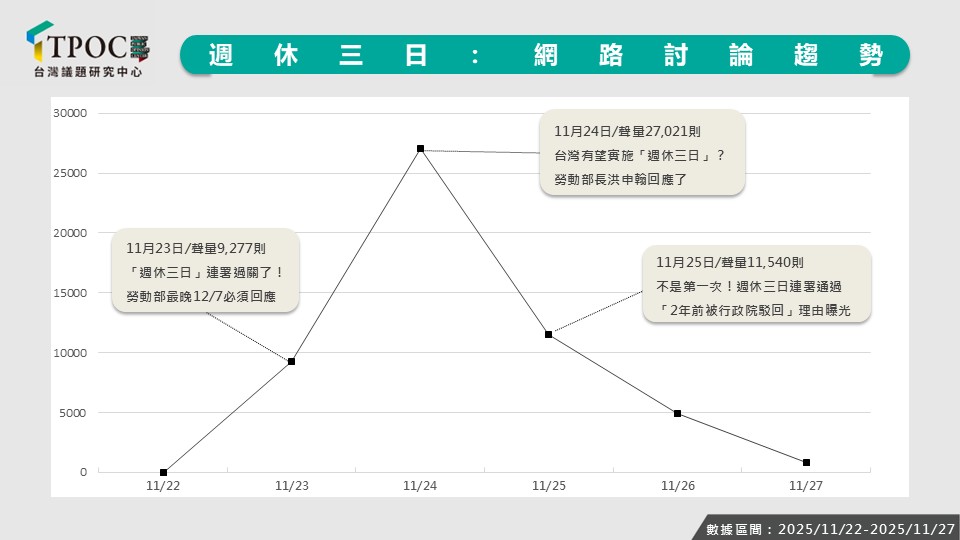聲量數據顯示,自11月23日「週休三日連署通過」的消息曝光後,當日網路聲量立即飆升至9千則,討論焦點多集中在「制度是否合理」及「政府如何回應」等議題,熱度迅速發酵。緊接著在11月24日,勞動部長洪申翰對此表態將「全面評估」,民進黨團也表示「支持所有社會聲音」。相關內容被廣泛轉載與討論後,當日聲量攀升至2.7萬則的高峰,同時出現更多關於薪資、工時等勞動市場層面的討論。