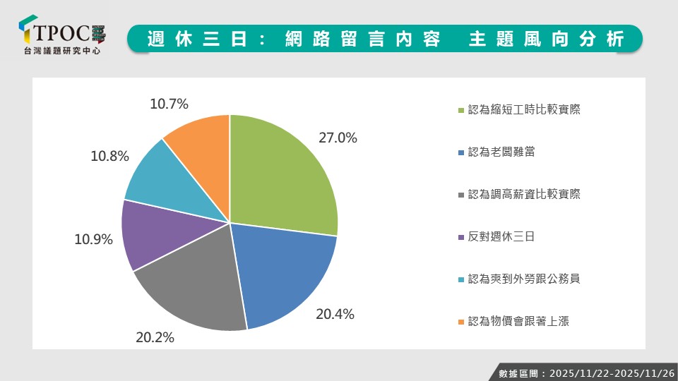 從熱門網路留言風向觀察,「認為縮短工時比較實際」的聲量佔27%,顯示網友普遍認為降低工時比直接推行週休三日更務實。其次,20.4%「認為老闆難當」,主要關注政策實施可能增加企業成本與管理負擔,並討論中小企業是否能承受額外休假安排。20.2%「認為調高薪資比較實際」,則反映部分網友認為直接提升薪資比調整休假天數更能改善勞動者福利。