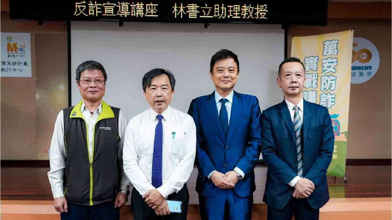 ↑圖說:銘傳大學犯罪防治系助理教授林書立博士(左二)應邀擔任講師,左一為敏盛醫院執行長張長榮、右二為萬安生命禮儀管理中心總經理蕭峰昇、右一為萬安生命北三部副總經理李志明。(圖片來源:台灣民間反詐騙協會提供)