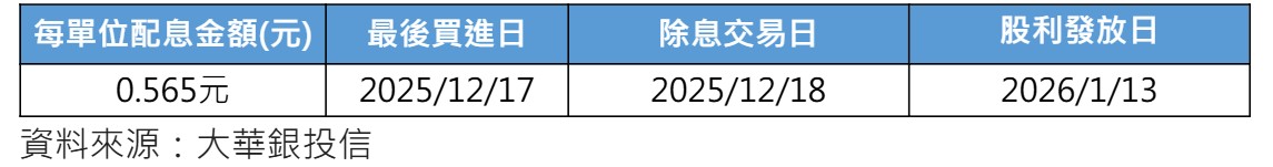 (00918) 大華優利高填息30年終配息初估出爐!官網公告每單位將配發0.565元,高於上季配發的0.52元,這次將於12月18日除息,投資人若想參與本次除息,最晚要在12月17日買進,本次股利將在明(115)年1月13日發放。