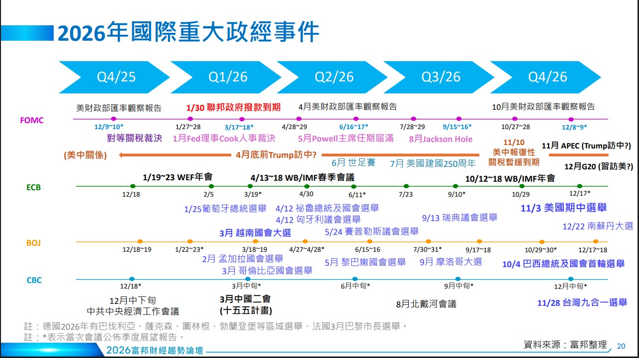 富邦金控首席經濟學家羅瑋博士(上圖右二,記者李錦奇攝影)指出,2026年隨著川普推動的各項政策明朗化,聯準會(Fed)動向更為清晰,不確定性下降,明年的全球經濟與金融市場三大基調為:全球經濟維持「溫和成長」;各國央行貨幣政策調整接近尾聲;區域地緣政治及國際貿易關係出現變化。