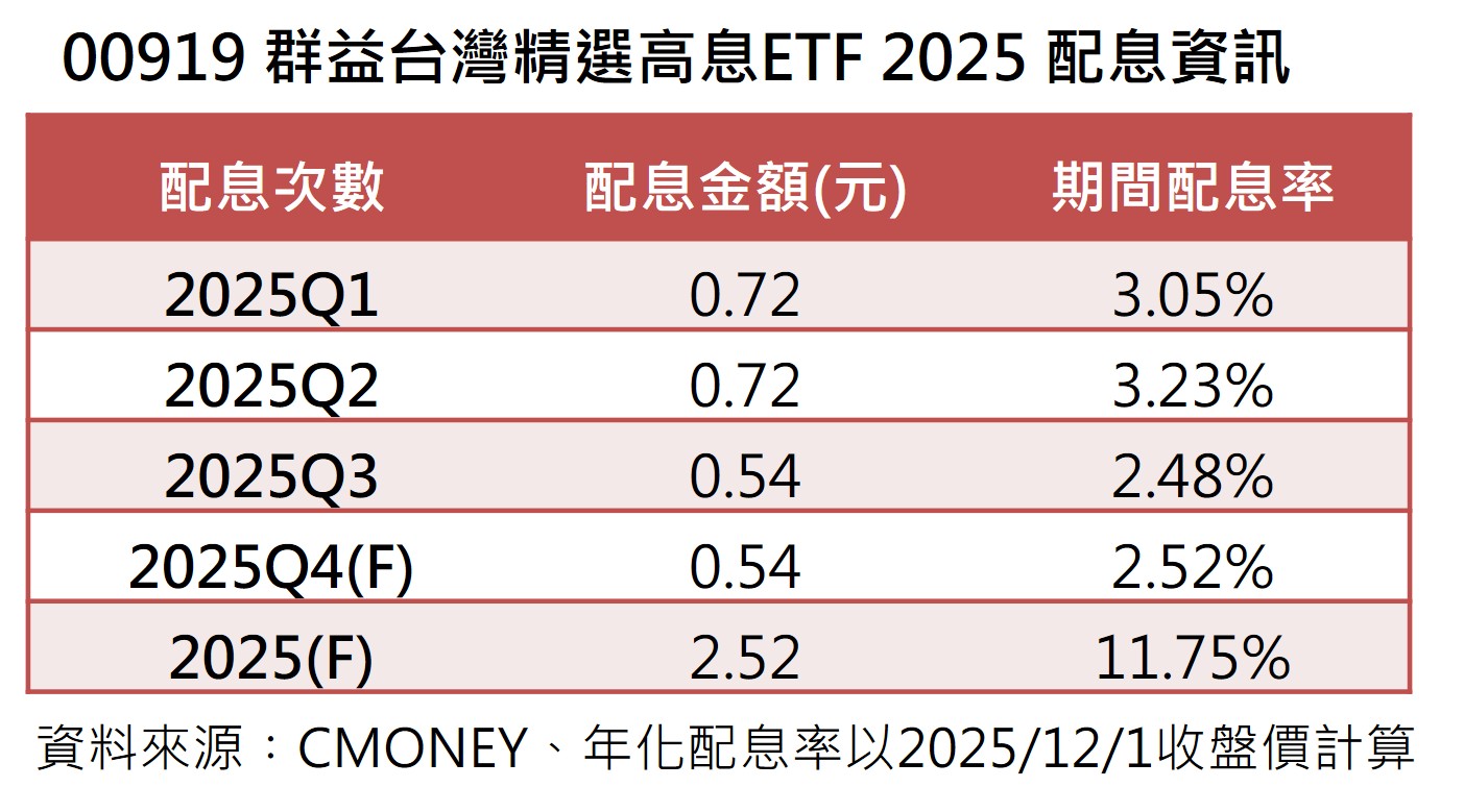 除息日方面,群益00919先上陣,12月16日除息,想參與除息的投資人,15日是最後買進日,配息發放日為明年1月13日。