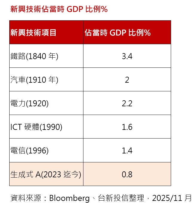 魏永祥指出,就投資比重分析,2023年以來,AI投資佔美國GDP比重僅0.8%,尚遠低於歷史上的新興技術如鐵路、汽車、電力、資訊、電信(5G)等時期,顯示目前AI投資並未出現過熱狀態。另就現金流分析,美國大型CSP (雲端服務商)的資本支出佔營運現金的比例隨持續提升,引發市場擔憂,但甲骨文(Oracle)、Meta、Google等科技巨頭開始密集發行高等級公司債,加上美國壽險公司積極認購,可望為AI資料中心建設提供穩定的「彈藥」。
