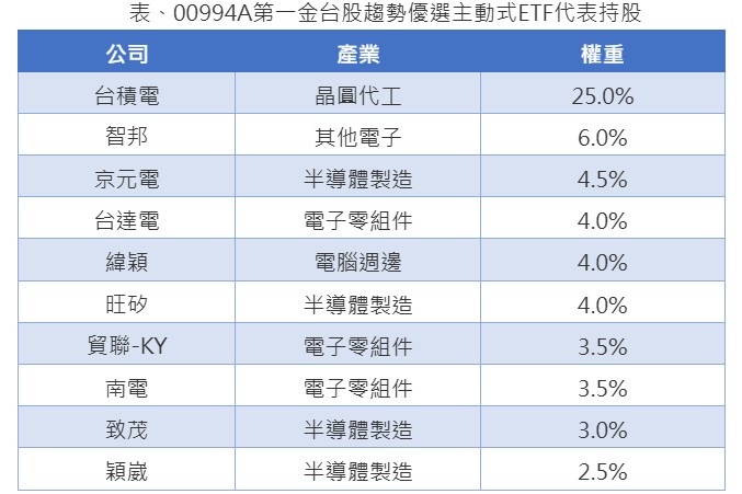 第一金台股趨勢優選主動式ETF(00994A)經理人張正中指出,過去一年,台股大盤因AI浪潮席捲,多頭行情延續,權值股如台積電表現尤為亮眼,帶動市場屢創波段新高,過往主動基金因法規限制,單一持股上限僅能配置10%,即便洞悉市場主流,也難以完全反映行情。