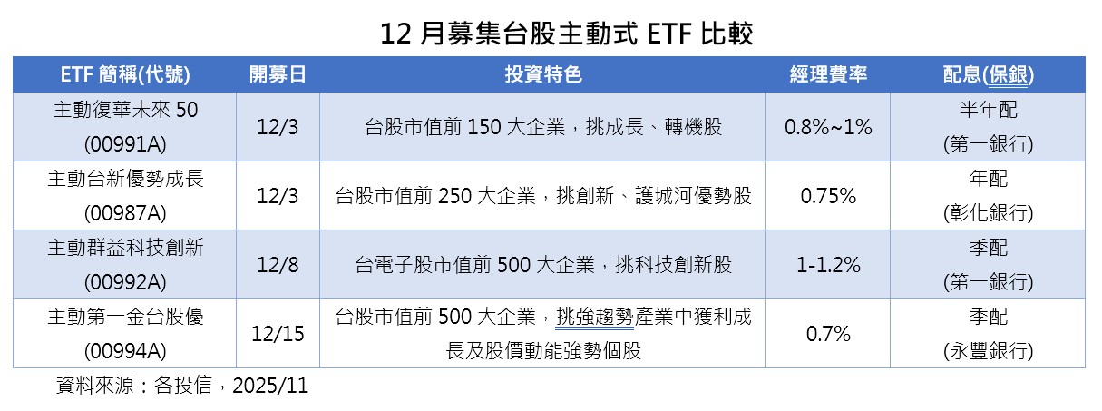 看準主動式ETF人氣爆棚,投信業者也紛紛推出新產品,近期共計有4檔要募集,3日開募的有主動復華未來50(00991A)、主動台新優勢成長(00987A),8日開募的是主動群益科技創新(00992A),15日接棒的則是主動第一金台股優(00994A)。