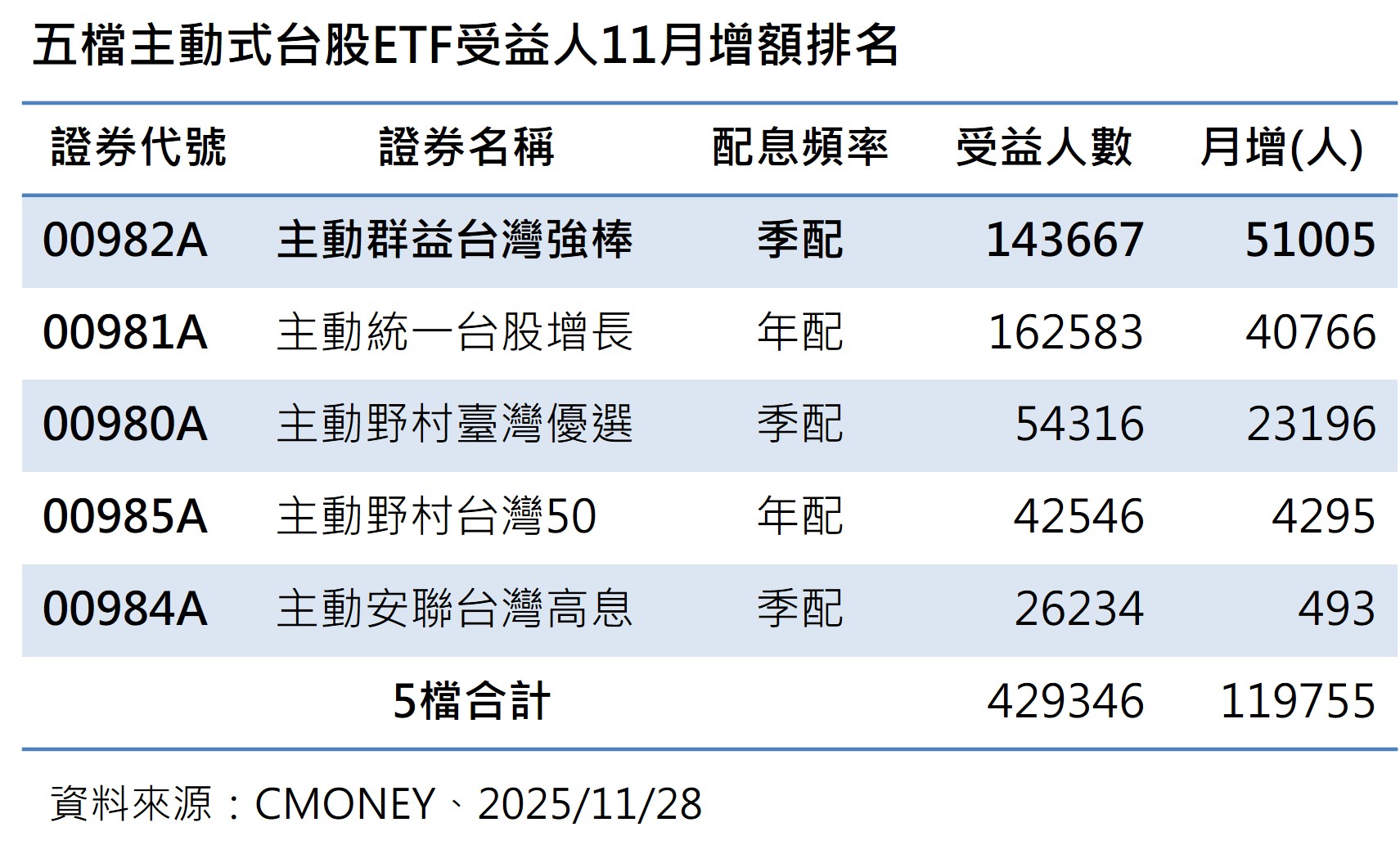 如果從11月表現來看,主動群益台灣強棒(00982A),受益人月增5.1萬人,是主動式台股ETF單月人氣王。