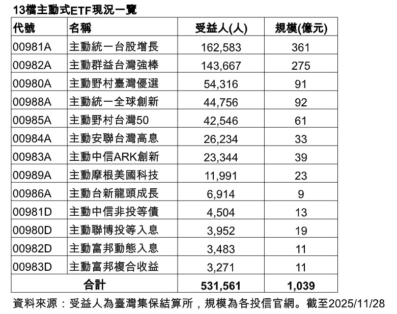 主動式ETF從5月開始在台登場,半年來成長快速,目前13檔主動式ETF合計受益人數已突破53萬人、規模已達1039億元;其中,5檔台股主動式ETF受益人數上周增加1.4萬人,統計總人數來到42萬9346人,連續第7周創下新高。