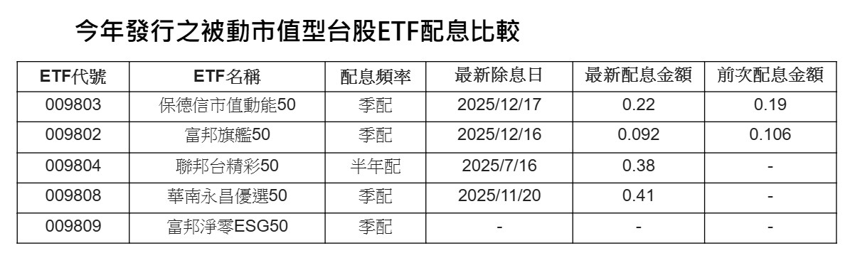 盤點今(2025)年發行的5檔被動市值型台股ETF新兵配息狀況,12月將有保德信市值動能50 ETF(009803)與富邦旗艦50(009802)分別於17、16日除息,其中,009803本次最新預估配息金額較前次配息0.19元更高。