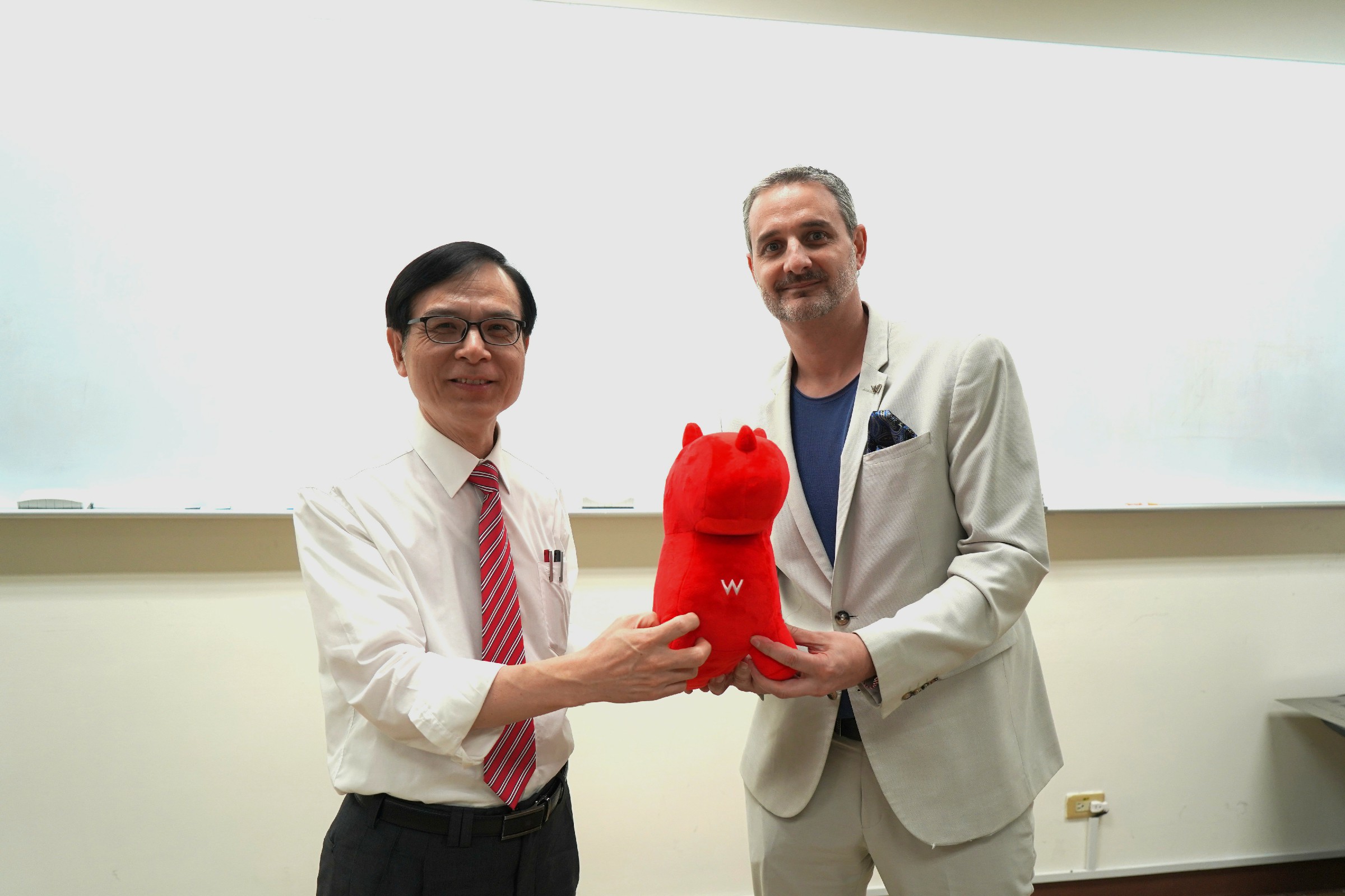 ↑圖說:萬豪國際集團台灣市場區域總經理 Mr. Bastien Giannetti送上吉祥物給高餐大代理校長陳國泰(圖片來源:國立高雄餐旅大學提供)