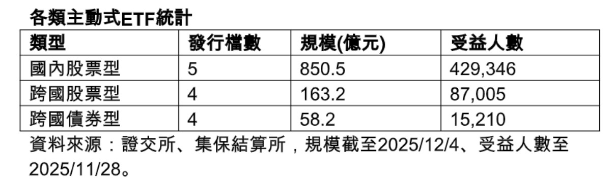 年底前,主動復華未來50(00991A)、主動台新優勢成長(00987A)、主動群益科技創新(00992A)、主動第一金台股優(00994A)等4檔產品將陸續募集,預料將持續推升規模及受益人數表現。