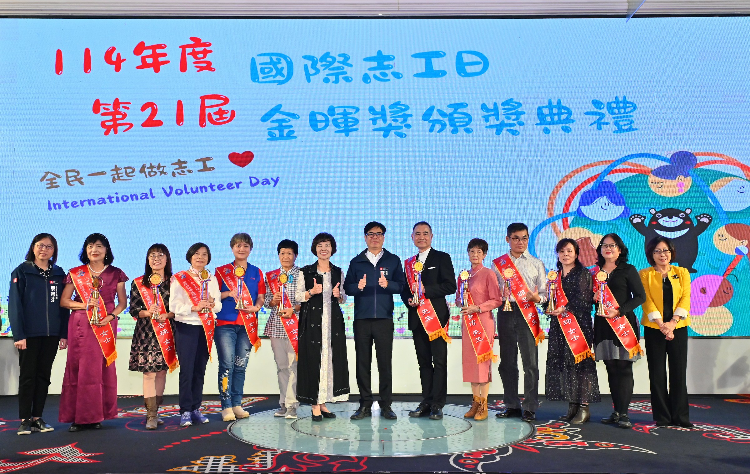 在國際志工日前夕,高雄市社會局與志願服務協會4日舉辦第21屆「金暉獎」頒獎典禮,向長年默默付出的志工致上最高敬意。今年共有24位志工、8個團隊及5個家族獲得高雄市志願服務最高榮譽「金暉獎」,由市長陳其邁親自頒獎,現場氣氛溫馨感人。