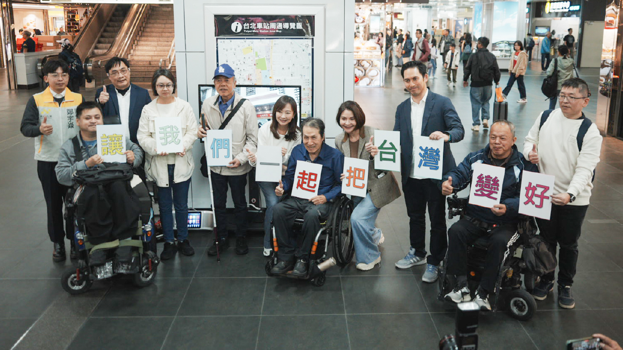↑圖說:由多個身心障礙團體共同發起的無障礙路線體驗行動5日下午在台北車站大廳展開,出席民代搭輪椅與身障者體驗台北車站的無障礙動線。(圖片來源:主辦單位提供)
