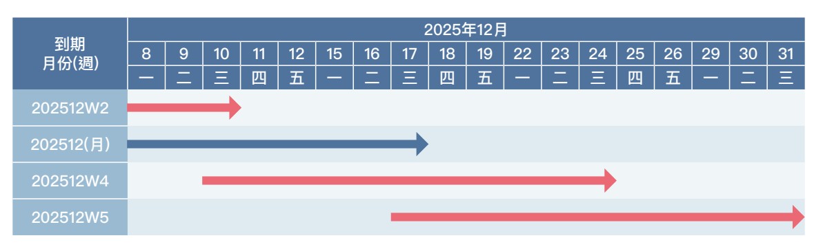 舉例來說,12月8日(本週一)掛牌的第一份契約,到期日是本週三(12月10日);12月17日(週三)沒有週契約到期,只有原本的月選擇權到期;12月10日掛牌的週契約,到期日是12月24日,以此類推。