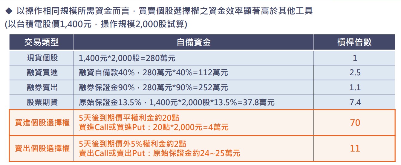 買方僅需支付權利金,即可建立個股選擇權部位,以台積電股價1400元,操作規模一口(2000股)試算,買進5天後到期的價平台積電選擇權,權利金約為20點,僅須支付4萬元;反觀若要買進台積電股票2張(2000股)需準備280萬元,如果要融資,也要自備112萬元。