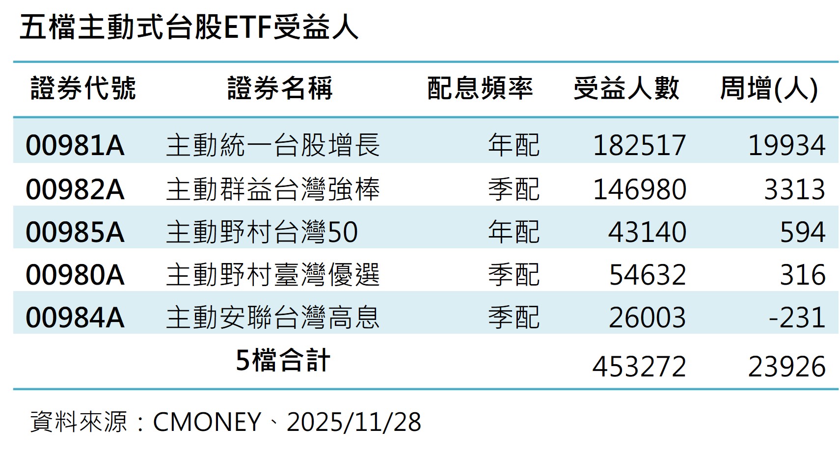 回頭來看台股ETF市場,今年人氣依舊強強滾,其中,新登場的主動式台股ETF,受到不少投資人青睞,檢視集保股權分散12月5日最新統計資料顯示,5檔主動式台股ETF整體受益人數周增2.3萬人,總人數來到45萬3272人,連續第8周創下新高。