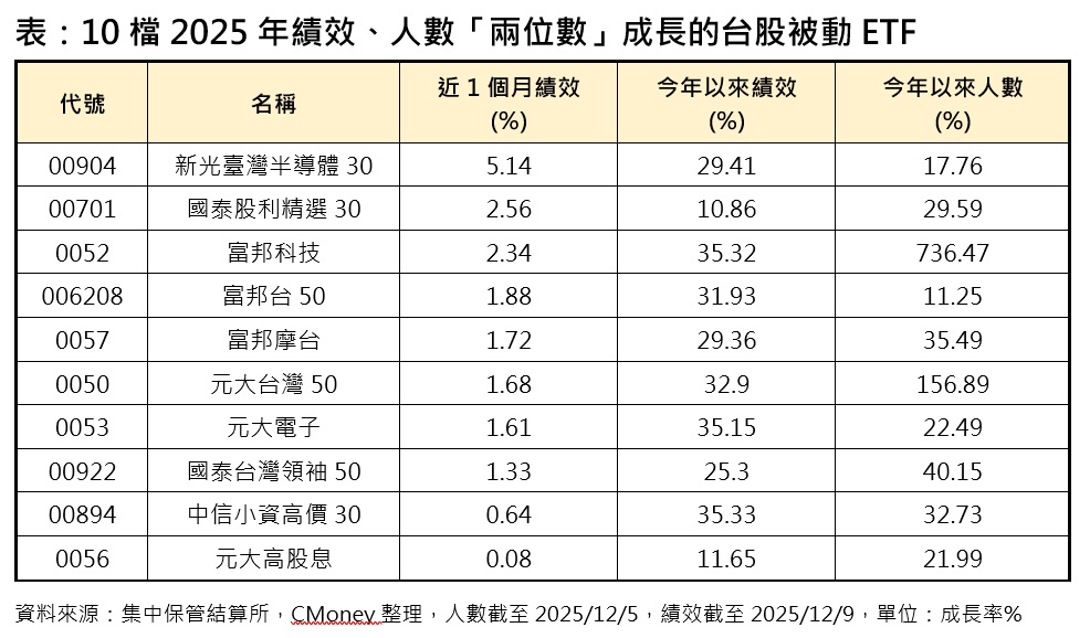 台股今年以來上漲22.3%,也帶動投資人湧入台股ETF,其中,有10檔台股ETF的受益人數、報酬率都達到「雙位數」成長,成為今年高人氣兼具績效的台股ETF。